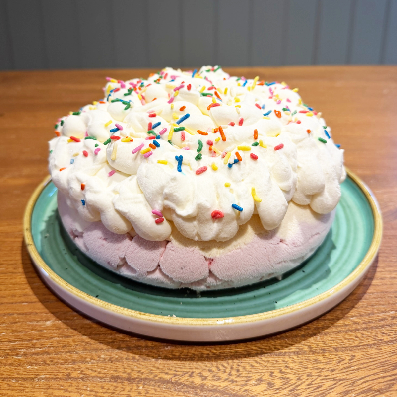 A modern semifreddo inspired by the beloved trifle. Layers of sponge, strawberry, custard and cream flavours come together and a touch of sprinkles for nostalgia and charm.